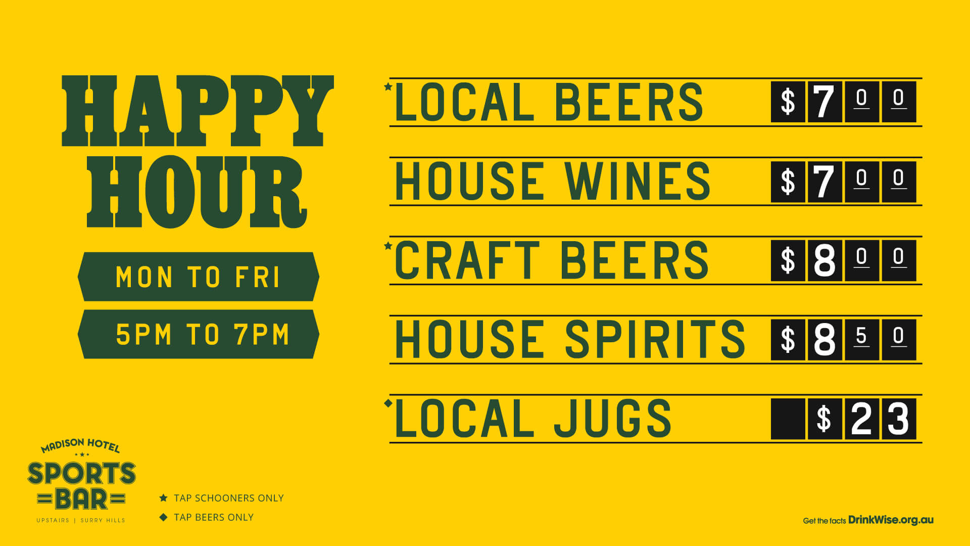Knock off and kick-on at The Maddo with our awesome happy hour drink specials Monday to Friday 5-7pm!